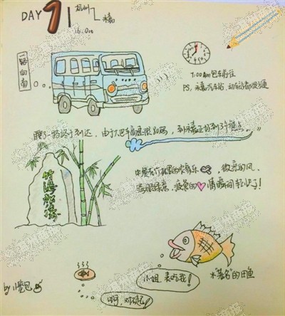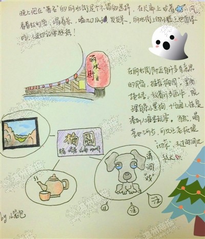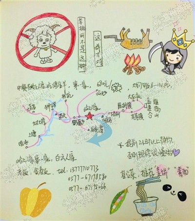 温州网讯 丽水街、石栀岩、烤全羊……这些可是永嘉楠溪江响当当的代言词,近日,一篇游客的手绘楠溪江游记,却让这些独特的标志物跃上画纸,一时间引来不少官方微博、官方微信转发。更有网友在论坛上贴出该游记,表示“这么萌的手绘楠溪江游记,不转不行”。永嘉官方微信平台转载了此帖后,三天时间点击率就近两千。昨日,记者了解到,这份最萌手绘楠溪江游记出自杭州一萌妹子之手。