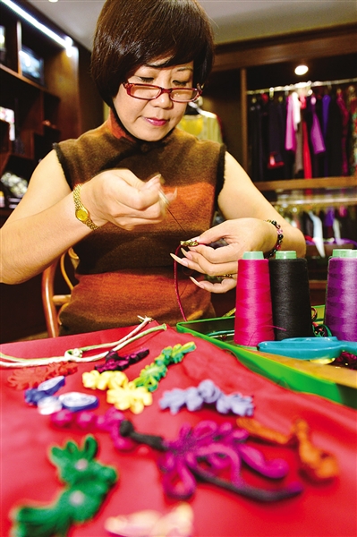 “现在会做纯手工盘扣的人越来越少了!一是因为没有多年的经验很难做出精致的盘扣,而那些机器批量生产的盘扣品种繁多价格也不贵,所以还是有不少师傅为了省事省成本选择机制的盘扣。只是,明眼人一看就会觉得少了几分灵气。另外,机器制的盘扣往往会在衣物清洗后变得松散失去形态,影响衣服的整体美感。所以,我们做的唐装旗袍还是坚持自己制作盘扣。学徒们只要愿意学,我也总是毫无保留,有些东西丢掉了真的很可惜……”余师傅的言语中既带着几分自豪,又夹杂着一丝忧虑。
