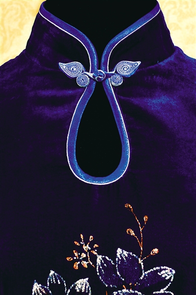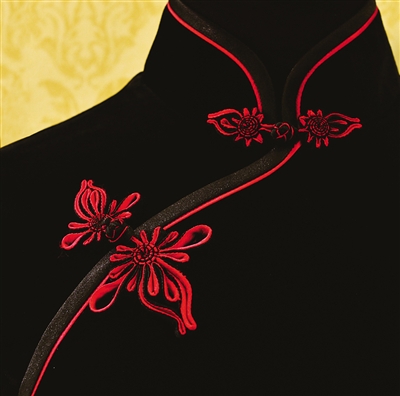 余微微师傅见我对盘扣感兴趣,笑呵呵地捧出了一大盒子的盘扣,如数家珍般介绍开来:“要说盘扣的款式,起码有近百种之多。这是花扣,这个是蝴蝶扣,你看像不像一对翩翩飞舞的蝴蝶?这是金鱼扣,瞧,这是金鱼的尾巴,要想把金鱼扣做得栩栩如生,可需要花点功夫。另外,还有琵琶扣、葫芦扣、菊花扣和叶子扣等等。在各式旗袍中,衣襟上选择一副合适的盘扣往往能起到画龙点睛的作用。”