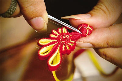 余微微师傅边介绍边开始演示手工制作一款金鱼扣。一把镊子夹着一条预先缝制好的细小硬布条在指尖翻滚,接着缝线、整形,没多久,一条活灵活现的“小金鱼”就被盘好了。