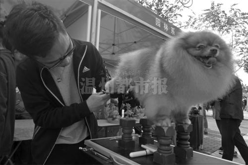 昨天下午,在温州科技职业学院毕业生底薪招聘会上,宠物医学、美容专业的师生现场为一只博美犬剪毛、美容,向企业展示专业技能。姚卡/摄