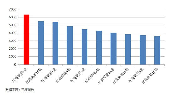 剧情的跌宕起伏和有针对性的文学作品的改编和演绎是这部剧备受关注的另一推动力。与原版相比,《红高粱》由家族利益争夺、男女感情纠葛逐步上升为民族大义,穿插了宅斗、剿匪、三角恋、抗战剧等戏码,这迎合了观众的趣味。从百度指数提供的数据来看,第六集最受关注,而这一集这正是上演经典桥段高粱地野合的一集。