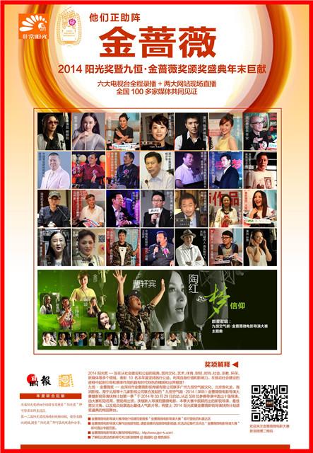 由深圳报业集团晶报社发起的晶报2014“阳光奖”与由深圳市金蔷薇影视传媒有限公司发起的“2014(深圳)金蔷薇微电影导演大赛暨新锐导演扶持计划第一季”双剑合璧,将于2015年1月10日联合举办“2014阳光奖暨九恒·金蔷薇奖颁奖盛典”。