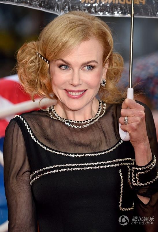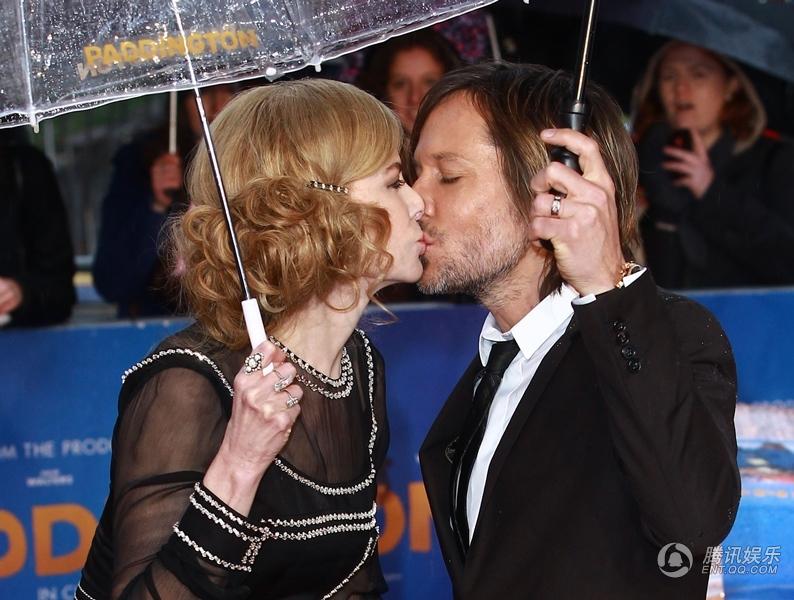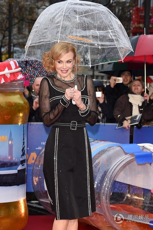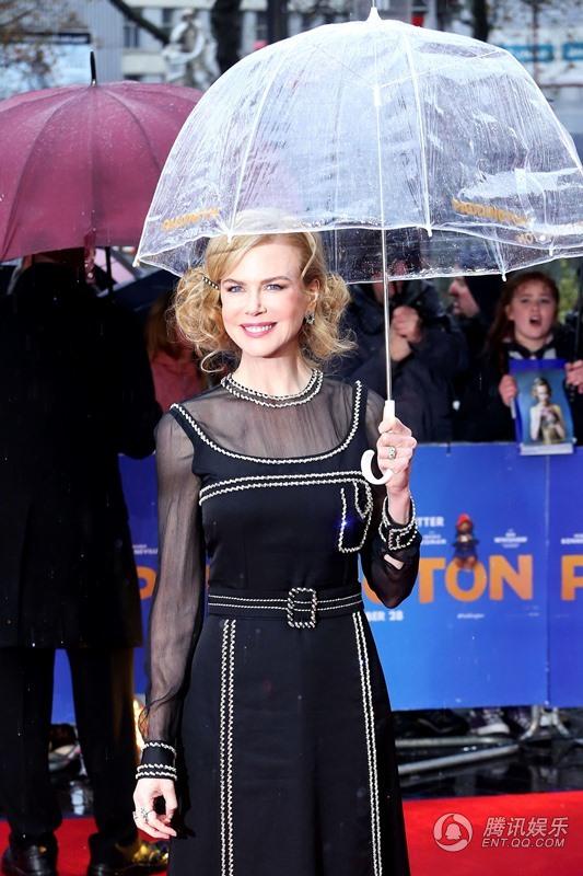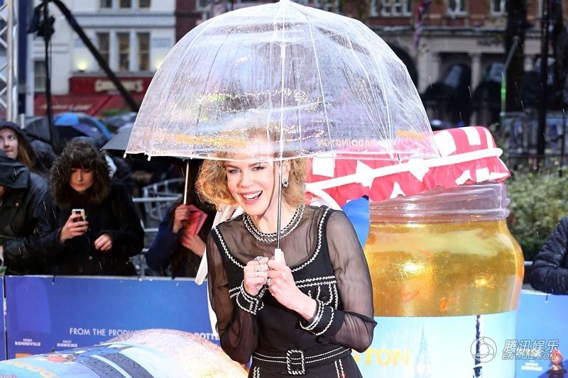 腾讯娱乐讯11月23日,真人喜剧动画电影《帕丁顿熊》在英国伦敦举行了盛大首映,该片主演妮可·基德曼、莎莉·霍金斯、本·卫肖、吉姆·布劳德本特、休·博内威利等明星悉数亮相红毯。当天虽下起淅淅沥沥的小雨,但群星兴致不减,纷纷撑起印有帕丁顿熊字样的透明雨伞,每个人都萌萌哒。奥斯卡影后、47岁的基德曼一身得体的黑色长裙展现曼妙身材,与其老公凯斯·厄本在雨中甜蜜亲吻,大秀恩爱,令人艳羡。