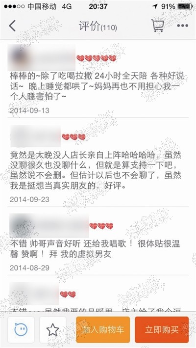 在一家信誉已达一颗钻的店铺里,记者看到店里出售的一款“虚拟男友”服务,已累计有一百多位位客户购买并给出评价,是温州地区同类卖家中销量和评价最多的。店主表示一般大部分人听到“虚拟恋人”,就会认为是宅男的专属产品,因此网上也是出售“虚拟女友”的店铺居多,但自己发现女生更容易被这样精神恋爱的方式打动,事实也证明“虚拟男友”的确大受欢迎,目前店里也在不断招人。