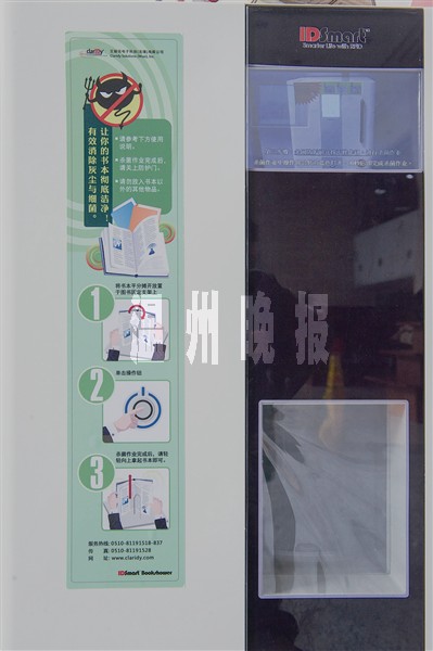 它是通过紫外线杀菌,并通过活性炭吸附异味,通过里面的内部空气循环,除去空气中的灰尘,整个过程只需30秒钟,一次可以消毒一本书。“平分摊开,是为了对书封和内页进行全面杀菌,杀菌过后的图书还附带芳香味。”