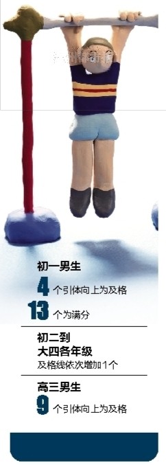 “测试中发现,一些学生别说在单杠上拉几个了,就光是双手握杠都握不住,特别是一些小胖墩。”市教育局体卫艺处有关负责人说。新标准中规定,初一男生做4个引体向上为及格,13个为满分。而从初二到大四各年级,及格线依次增加1个,高三及格线为9个。