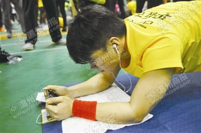 首先进行的是平板支撑大赛的总决赛,10点,比赛正式开始,时间一分一秒过去,汗珠开始从选手们的额头上渗出来,几分钟后,一些人体力不支,身体开始颤抖,实在坚持不住,双手一软,趴在自己的垫子上。