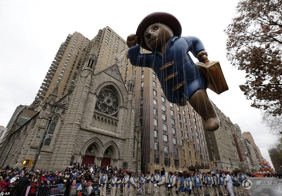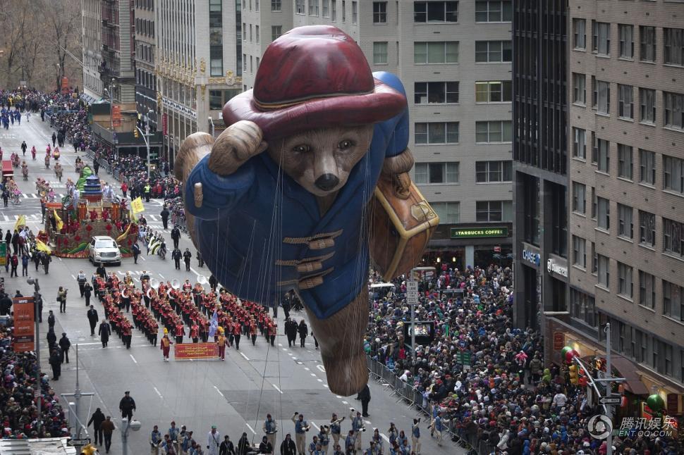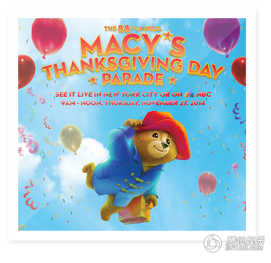 而北美地区的观众要耐心等到2015年1月16日才能看到可爱的“帕丁顿熊”登陆院线,虽然离北美上映时间还有一个月,但可爱的“帕丁顿熊”却在感恩节当天率先亮相美国纽约街头,巨大的帕丁顿熊气球生动呈现了小熊奔跑的造型,手中时刻紧握着它的小行李箱,甚是可爱。巨大的帕丁顿熊气球成为感恩节游行活动的最大亮点,这也是“英国籍”的帕丁顿熊首次亮相美国传统的感恩节游行活动,是英国文化与美国文化的一次融合,萌萌的帕丁顿熊与350万纽约市民共狂欢庆祝感恩节,更是引得路人欢呼雀跃。