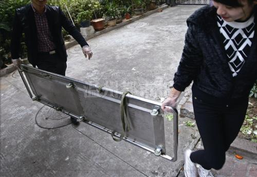 记者(右)和一名“接尸工”一起抬着担架,来到市区某老人公寓。记者 黄攀/摄