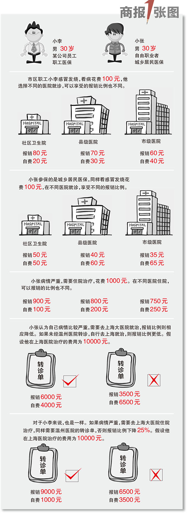 以市区职工小陈为例,肠胃绞痛拉肚子时,如果跑到附一医去看消化科,符合医保规定的费用有500元,就能报销300元;但如果去了龙湾区人民医院,就能报销350元;当然,到社区医院的话,能报销400元。看病费用越高,到大医院和社区医院的报销相差得也就越多。
