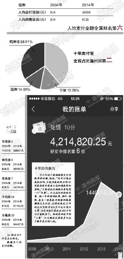 2014年支付宝总支账单中,温州的乐清、瑞安、苍南、平阳、永嘉分别排在全国的第5、6、7、24、25位。