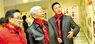 在瓦市小学校史馆前,我国石油天然气地质学和地球化学专家,中国科学院院士戴金星碰见了老校友——温籍著名画家孟庆江,他们在瓦市小学师生的簇拥下参观校史馆,一路上听讲解,看资料,并与师生亲密互动交流。