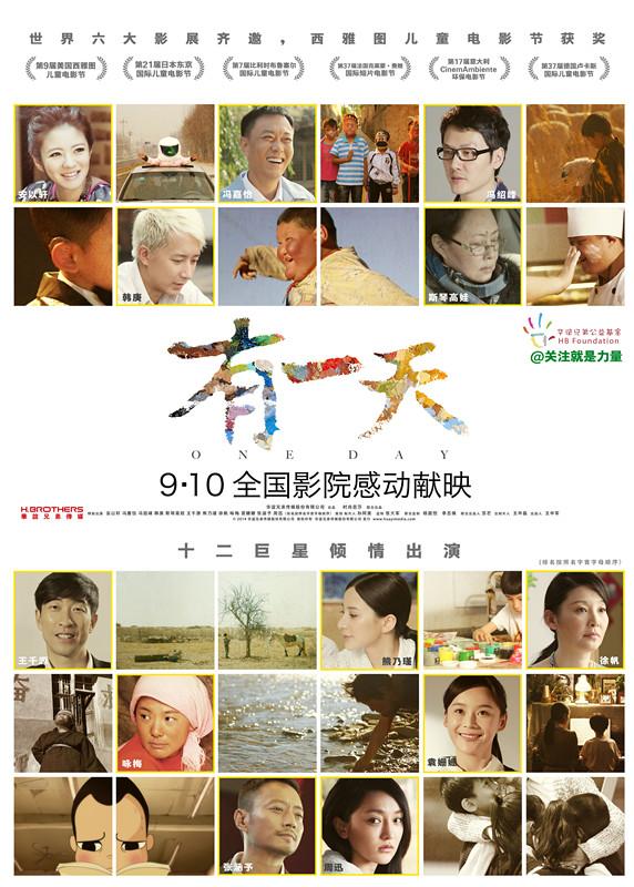 《有一天》聚集了周迅(微博)、韩庚、冯绍峰(微博)(微信号:fengshaofeng1007)、袁姗姗、张涵予、安以轩(微博)(微信号:anyixuanhy)、徐帆、斯琴高娃、王千源(微博)、熊乃瑾(微博)、咏梅、冯嘉怡等十二位明星,通过九个感人而有趣的故事,呼吁大家关注九类特殊儿童群体。该片由华谊兄弟公益基金发起项目,演员0片酬出演,华谊0分账出品和发行,全国多院线达成一致以“5元公益价”上映,从制作到宣发屡屡突破传统,不但树立起国内公益电影的新标杆,更突破电影行业,将公益的接力棒传递给了更多的企业和品牌。自今年9月10日全国公映至今,得到了很多人的帮助,超过30位的明星以不同方式参与其中,近500人参与拍摄、制作、宣传、发行,各地院线也以爱心接力的形式支持中国第一部公益电影,首日上映当天就有24.8万人次涌进电影院观看,目前,电影还在以其顽强的生命力上映。周迅和周迅工作室发起的One Night公益演唱会不扣除成本已向华谊兄弟公益基金捐款3,023,350元,支持《有一天》接着拍。《有一天》的发起人和制片人孙阿美,也因其电影独特的运作模式及社会影响力,入围了网易最有态度人物。凝聚众人爱心之力,《有一天》夜以继日,爱不停歇。