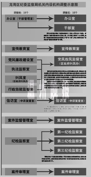 龙湾区纪委负责人表示,调整内设机构是为适应当前反腐败斗争形势而作出的重大举措,目的是为了进一步找准职能定位,转变工作思路,将力量集中到监督、执纪、问责中心上来,以更好地服务保障党委政府中心工作,做到不缺位、不越位、不错位。