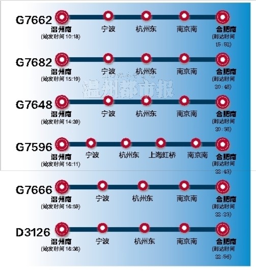 温州网讯 昨天,全国铁路新运行图正式实施。温州南至武汉的高铁首次开通。调整后,温州有6对动车的终点到达站延伸到合肥南站,温州共有15趟动车延长到站区段,并新增了5对始发列车。