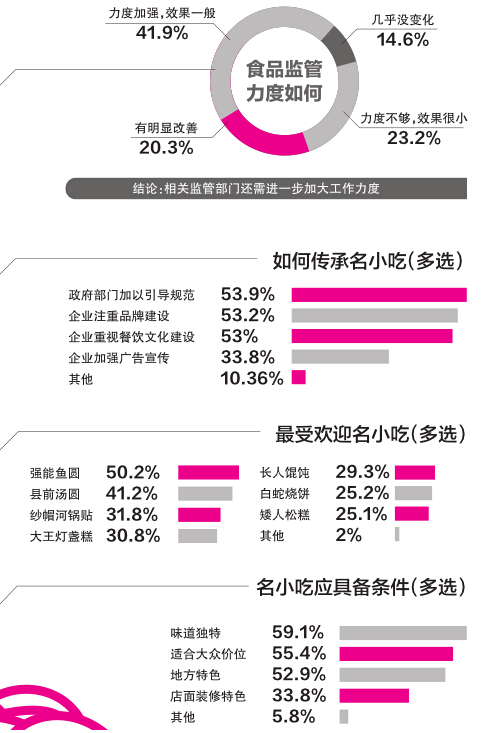 调查中温州名小吃成为众望所归,鹿城区消保委人士表示,随着温州经济的多元化发展,这些名小吃在外来品牌的冲击下渐渐流失,加上温州餐饮文化建设步伐的相对滞后,本地名小吃的发展正处在瓶颈状态。为弘扬瓯越文化、传承温州名品,建议政府相关部门加大对温州餐饮行业的扶持力度,借鉴成都、杭州等地先进经验,打造类似“锦里”“宽窄巷”“梅家坞”等有品位的特色街,并在财政、税收、金融等方面予以政策倾斜,帮扶和培育一批温州名小吃、温州名优特产龙头示范企业,从而带动温州餐饮企业向品牌化、规模化全面发展,成为温州时尚之都的一道亮丽风景线。