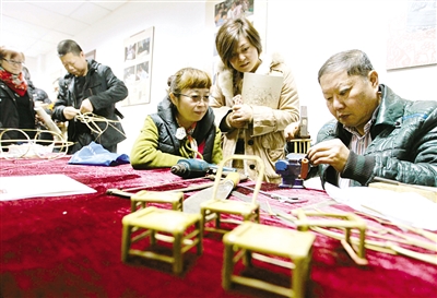 图为民间艺人王炳宣在大生堂非遗展示馆表演小竹椅的制作。 陈翔 佳慧 摄