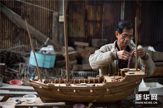 谈锦全在澳门荔枝碗造船厂制造渔船模型(12月10日摄)。从14岁开始学习造船手艺的谈锦全,在造船厂工作了三四十年。