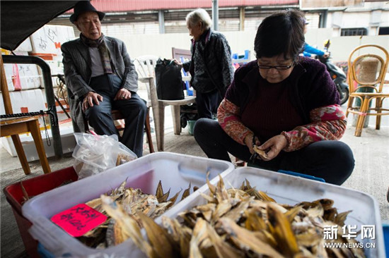 澳门内港咸鱼海味店的店员在整理货物(12月10日摄)。