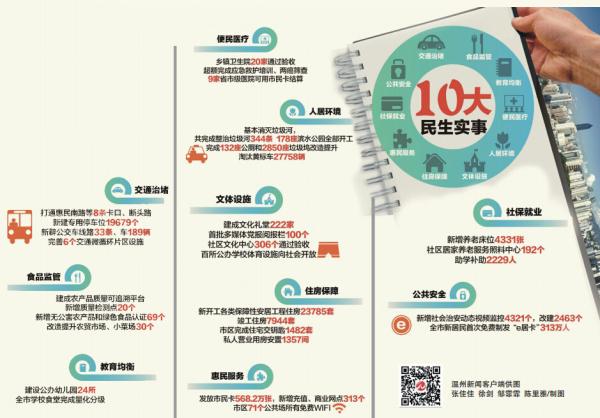 据悉,今年的十大民生实事涉及交通治堵、食品监管、教育均衡、便民医疗、人居环境、文体设施、住房保障、惠民服务、社保就业、公共安全等十方面。其中,打卡口接断头路、交通微循环、滨水公园、学校食堂安全量化管理、市区公厕改造提升、老旧小区垃圾坞改造、农村(社区)文化礼堂等项目已产生良好的社会效益。