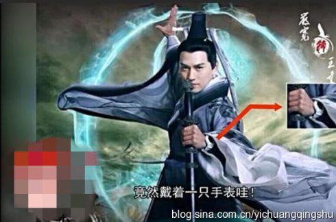 开播前的一组定妆照中,严宽扮演的王重阳一身古装,酷劲十足,但古装之下的手腕上,一只白色手表却十分显眼。看到该定妆照穿帮处的,网友纷纷吐槽:“表是什么牌子?”“那是穿越的按钮!”“王重阳会射麻醉针吗?”