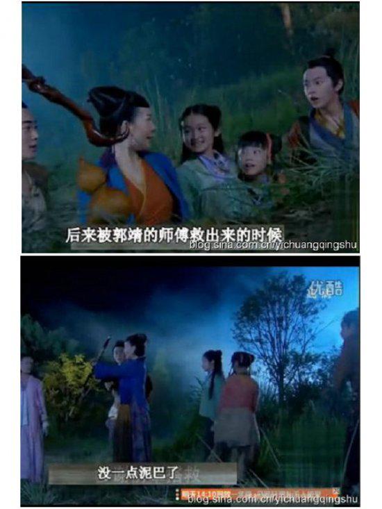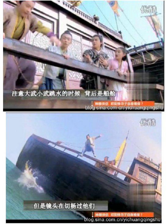杨过为了捉弄大武和小武,将郭芙心爱的坠子丢进水中,要大小武兄弟去捡,大家注意看,大小武跳水时背后的镜头是船舱,但是镜头一拉远,后面的背景居然是船帆,于妈妈,你们用替身可以,但是背景要一致呀。