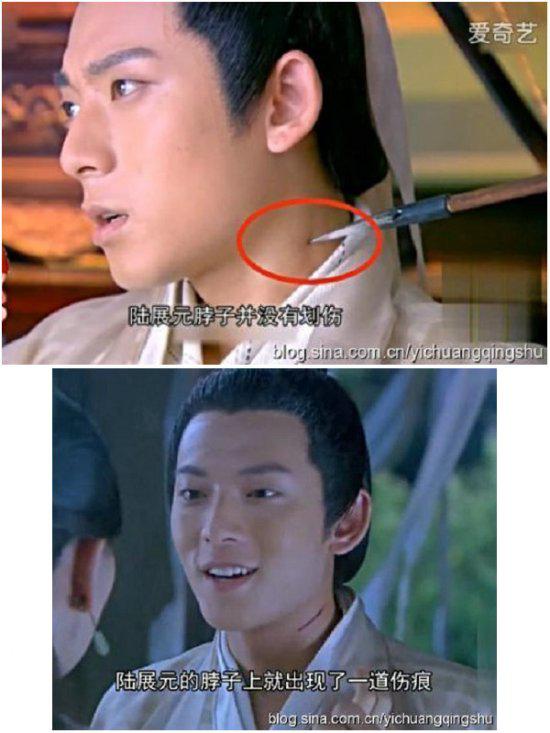 何沅君和陆展元私奔,为了逼迫李莫愁赶快离开,何沅群用箭指着陆展元的脖子,根本就没伤痕,更没有出血,但是撞头一转,陆展元的脖子上却有一根长长的伤痕,我说,这造型师也太不上心了吧?