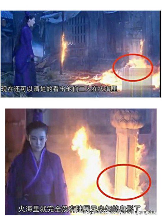 10年后,李莫愁来寻仇,将何沅君、陆展元夫妇逼死,然后李莫愁用一把火烧了他们夫妻俩,这时我们可以清楚的看到他们两人在火海里,但是李莫愁一转身,火海里却完全没有陆展元夫妇的身影了,我说导演,我知道你不可能烧死两个真人,但是你能不能换外拍摄角度呀,这也太假了吧。