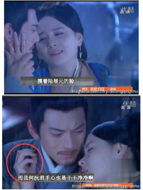 同样是李莫愁自杀这场戏,何沅君用剑自杀,一剑穿心,然而陆展元抱着她哭泣,我们可以看到何沅君用沾满鲜血的手抚摸陆展元的脸,但是下一个镜头,我们却看到陆展元脸上一点血迹都没有了,这到底是怎么回事呢?