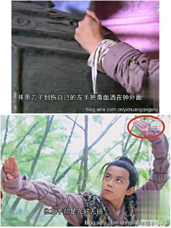 为了逃避黄蓉和郭靖的追踪,杨过将西毒欧阳锋藏在寺庙的大钟下,并且用刀将手划破,把毒血洒在大钟上,不用说,杨过的手上肯定有一个大伤口,而且流着血,但是镜头一转,杨过和黄蓉对打时,他的手一滴血都没有,更不可能有伤口,这,杨过小侠身上的功能好强大,居然能自动修复。