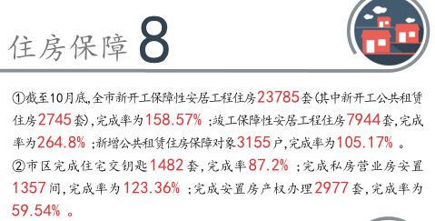 截至10月底,全市新开工保障性安居工程住房23785套,完成率158.57%;竣工保障性安居工程住房7944套,完成率264.8%;新增公共租赁住房保障独享3155户,完成率105.17%。