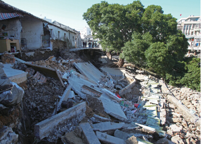 坍塌的路段位于乐清市北白象镇金炉村老人活动中心对面河岸,据记者目测,长约20米,宽约6米,深约2米。昨天上午记者来到现场时,坍塌地点一片废墟,满地碎石、淤泥,一棵大榕树倒在淤泥中。多间房屋的墙倒塌,房内一片狼藉。