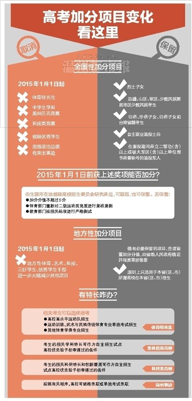 温州网讯 国家教育部昨天出台《关于进一步减少和规范高考加分项目和分值的意见》及《关于进一步完善和规范高校自主招生试点工作意见》。意见规定,2015年1月1日起,将取消奥赛等5项全国性鼓励类加分项目,只保留“烈士子女”等5类加分项目。不过有专业人士认为,奥赛获奖考生仍将在高校自主招生中具备优势。