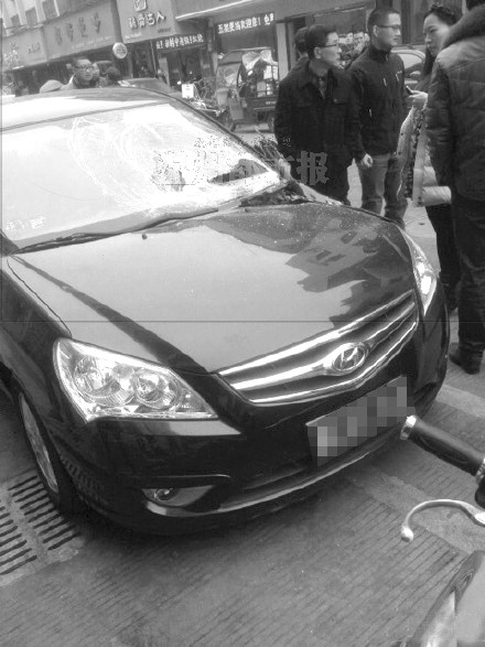 在现场可以看到,临街的该住宅楼楼下,停靠着一辆被砸的黑色现代轿车。该车前挡风玻璃被砸破,车上和附近地上还留有血迹。