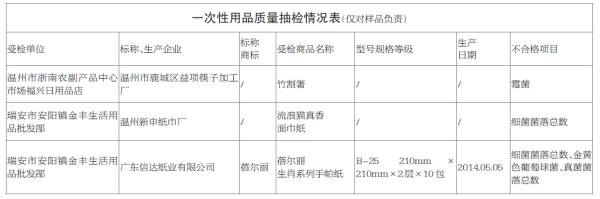 温州网讯 你使用的一次性用品卫生吗?近日,温州市市场监督管理局针对流通领域一次性用品开展专项抽查检验活动并公布抽检结果。据悉,本次抽检范围覆盖鹿城、乐清、瑞安等县(市、区),共抽检6家单位经销的45批次一次性用品,其中有3批次不合格,合格率93.33%。