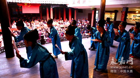 在大若岩镇荆州村举办“抱朴之域农耕乐土”文化礼堂开堂仪式暨“村晚”上,举行了七岁开蒙礼仪、敬老礼仪、做善事等活动。仪式后,村民自编自导自演的“村晚”热热闹闹上演,精彩的演出让村民大饱眼福。据了解,今年以来,我县在荣膺2013年“全省文化礼堂建设先进县”的基础上,精心谋划,创新载体,紧扣有“魂”、有“型”、有“范”、有“神”、有“量”等“五个有”,力推文化礼堂建设再上新台阶。截至10月底,提前两个月超额建成26所文化礼堂,并通过蓬勃开展开堂仪式、“村晚”活动、理论宣讲、“道德模范”、“最美系列”评选等活动,接地气、聚人气、扬正气、凝神气,使文化礼堂管起来、用起来、活起来,真正成为农村基层的文化地标,成为广大群众的精神家园。