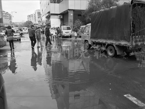 铁道大厦前的十字路口处,路面上有大面积积水,三处窨井盖不断往外涌水。