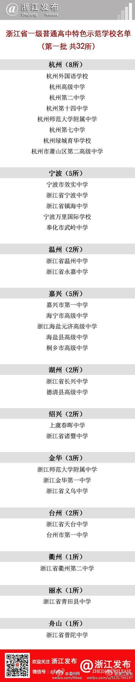 日前,省教育厅公布了13所学校为省一级普通高中特色示范学校。这13所学校分别是:慈溪中学、温州第二高级中学、瓯海中学、吴兴高级中学、绍兴市柯桥区柯桥中学、上虞中学、义乌市义亭中学、浦江中学、台州中学、温岭中学、衢州高级中学、江山中学、舟山中学。