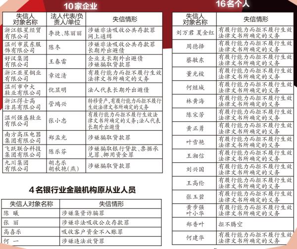 此次曝光的30个“老赖”,包括浙江银星经贸有限公司、南方高压电器集团有限公司、九川集团有限公司等10家企业和16名个人及4名银行业金融机构原从业人员,这些“老赖”筛选自公安、法院及各县(市、区)政府、我市银行业金融机构。目前,这些“老赖”中,部分已被拘捕或判刑,部分仍长期在外逃躲债。