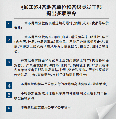 元旦春节期间,“酒局”、“牌局”的问题容易滋生。为此,市纪委要求各级党员、干部一律不准在私人和企业会所、高消费餐饮场所、单位食堂、内部招待所、农家乐等场所搞变相的公款大吃大喝;省内公务接待一律不准提供各类烟酒;同城一律不准安排公务用餐;参加私人聚会(休闲娱乐活动)和自费餐叙应注意形象,不能失态,不劝酒、不醉酒、不酗酒,更不得酒后驾车、酒后滋事;参加休闲娱乐活动要区分场合,把握分寸,注意形象,不得接受和持有私人会所会员卡,不进高消费娱乐、健身场所,严禁进入营业性娱乐场所接受有偿陪侍服务。上班时间、工作日午休和公务出差期间一律不准参与打牌、打麻将等活动;严禁组织和参与赌博活动。