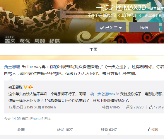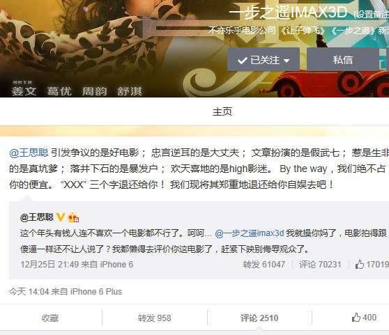 下午14时,《一步之遥》片方也终于再度反击,称“引发争议的是好电影;忠言逆耳的是大丈夫;文章扮演的是假武七;惹是生非的是真坑爹;落井下石的是暴发户;欢天喜地的是high影迷。 By the way,我们绝不占你的便宜”,似有借机向观众解释影片深刻内涵之意图。片方继续对王思聪喊话:“‘XXX’三个字退还给你!我们现将其郑重地退还给你自娱去吧!”“你的出现帮助观众看懂看透了《一步之遥》。还得谢谢你。你若再骂人,就回家对着镜子狂骂吧。低级行为无人陪伴。来日方长后会有期。”