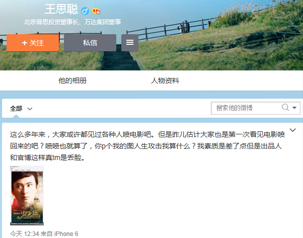 今天中午12时许,王思聪再次在微博中开火:“这么多年来,大家或许都见过各种人喷电影吧。但是昨儿估计大家也是第一次看见电影喷回来的吧?喷喷也就算了,你p个我的图人生攻击我算什么?我素质是差了点但是出品人和官博这样真tm是丢脸。”