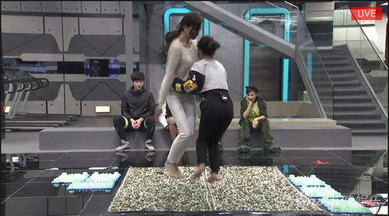 而第二组徐立和张暖雅选择了隐忍,一直闷声不响地在指压板上移动。其他选手在旁边说:“疼你们就叫出来吧,叫出来就会好很多。”可是两人却始终不发一语。直到张暖雅顺利走到了跳绳用的指压板边,徐立依然因痛行动迟缓,未能到达指定地点。张暖雅站在指压板上耐心等着徐立,并劝说她“叫出来吧”。徐立终于忍不住大叫,此时她脸都憋红了。事后张暖雅在微博上坦白自己并非那么坚强:“走到一半我咬着牙,眼角滴了一滴泪水……”