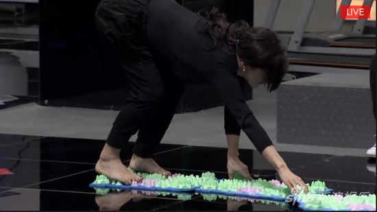 这时节目组广播告知,完成任务的选手可以获得5000能量值。刘妙自告奋勇想要尝试一下指压板跳绳的感受,结果勇气十足地开始,跳了一个就默默放下了跳绳。邢昭林和王希维也在尝试之后选择放弃。洪宏星一开始难以忍受指压板带来的痛楚,跳了一个之后走下指压板放松双脚,然后又毅然重新拿起跳绳完成了五跳,成功收获5000能量值,将硬汉风格进行到底。洪宏星在微博晒出抓狂表情自拍和脚底特写,感慨道:“这五千能量值真难赚,为了大家的方便面拼了啦!看这指压板多尖啊!脚底都瘀点了。”(实习生江轩/文)