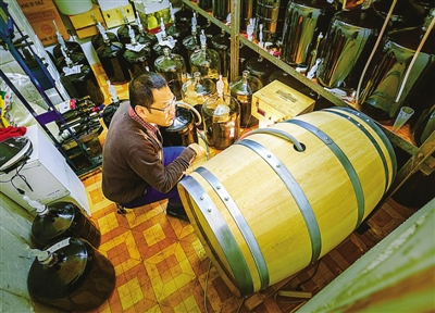 今年,韩少武花了8500元从网上订购了一只橡木桶,把葡萄酒放入橡木桶中贮藏,橡木中的鞣酸单宁、内酯等物质会进入葡萄酒中,葡萄酒的香味会变得更好。