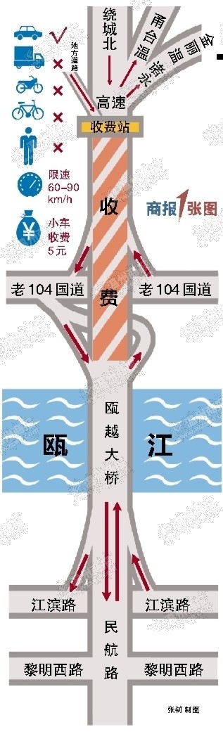 经瓯越大桥往返市区与三江免费,经瓯越大桥上下诸永高速收费,七座及以下的小型客车收费5元/辆次,其他车辆按对应的标准收费。