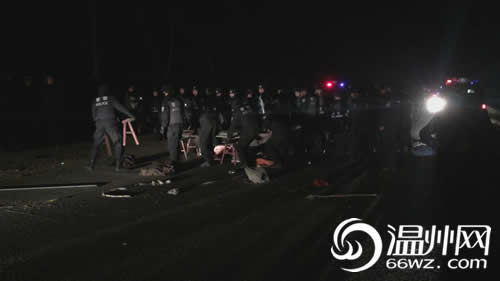 30日凌晨2时许,在多次劝说无果的情况下,苍南警方当机立断,架起人墙将闹事人员和停尸棚隔开,并对停尸棚进行拆除,同时对挑头人员进行强制传唤,确保了交通主干道的通畅。