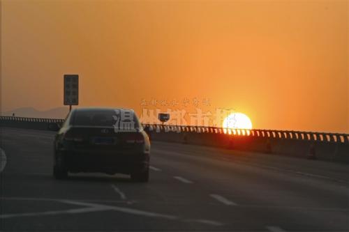 昨天,在乐清往温州市区方向的高速上,能看到落日的余晖映红了半边天。姚卡/摄