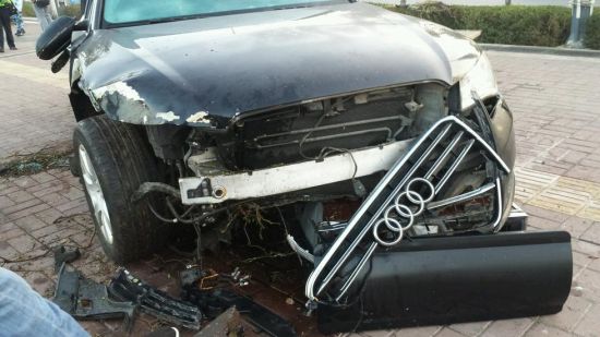 据报道,发现奥迪车的地方在云南滇池畔的大坝平台。图片中,奥迪车尾未见明显损伤,前车轮下碾压着果皮箱,车头损毁严重,保险杠已被撞脱落,露出白色的车架结构。右侧车头后视镜摇摇欲坠,转向灯及轮胎上侧的挡板已不见踪影,靠近车门处一截挡板卷了起来。副驾驶位车窗玻璃全部碎裂,安全气囊已弹出。